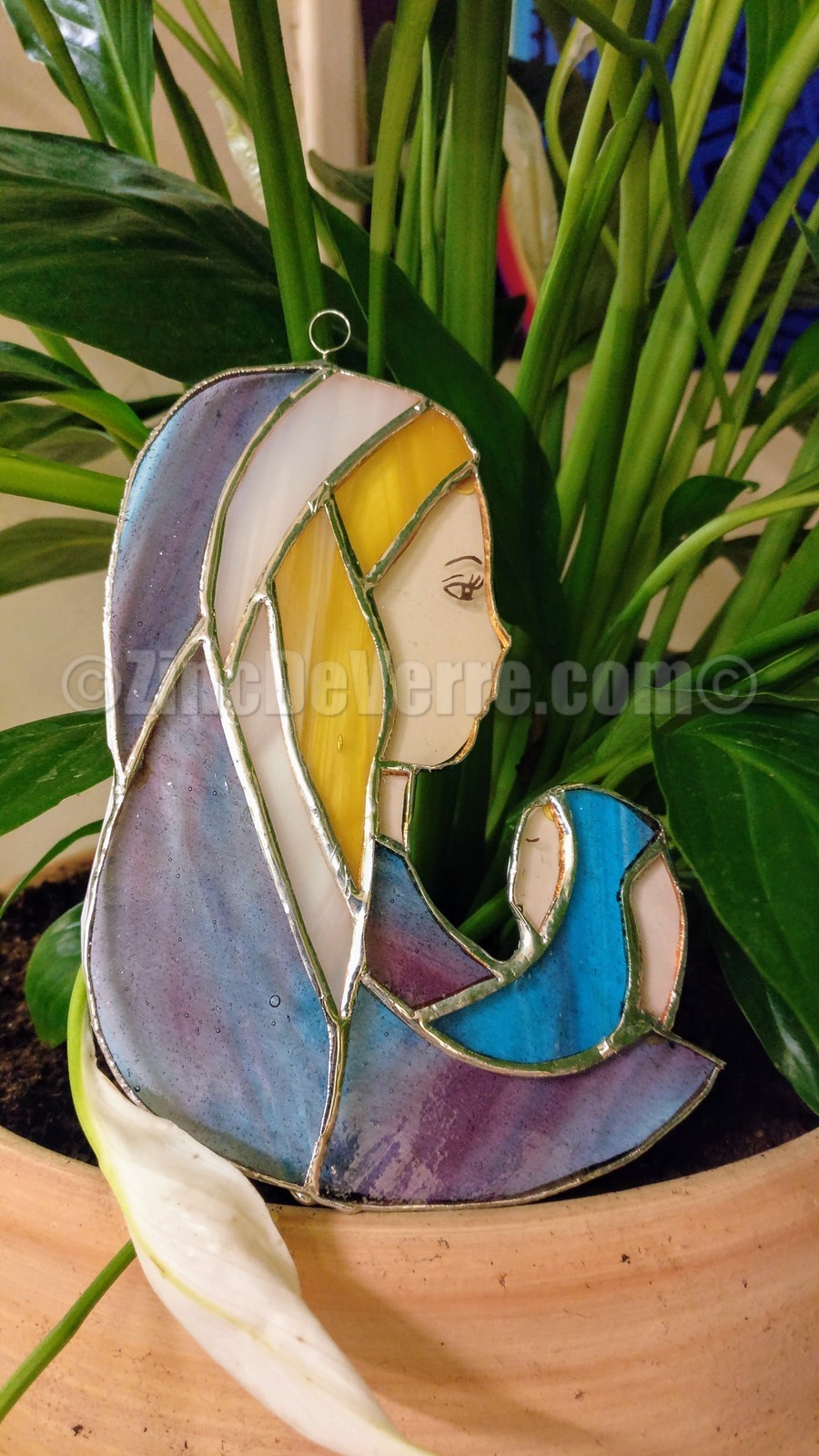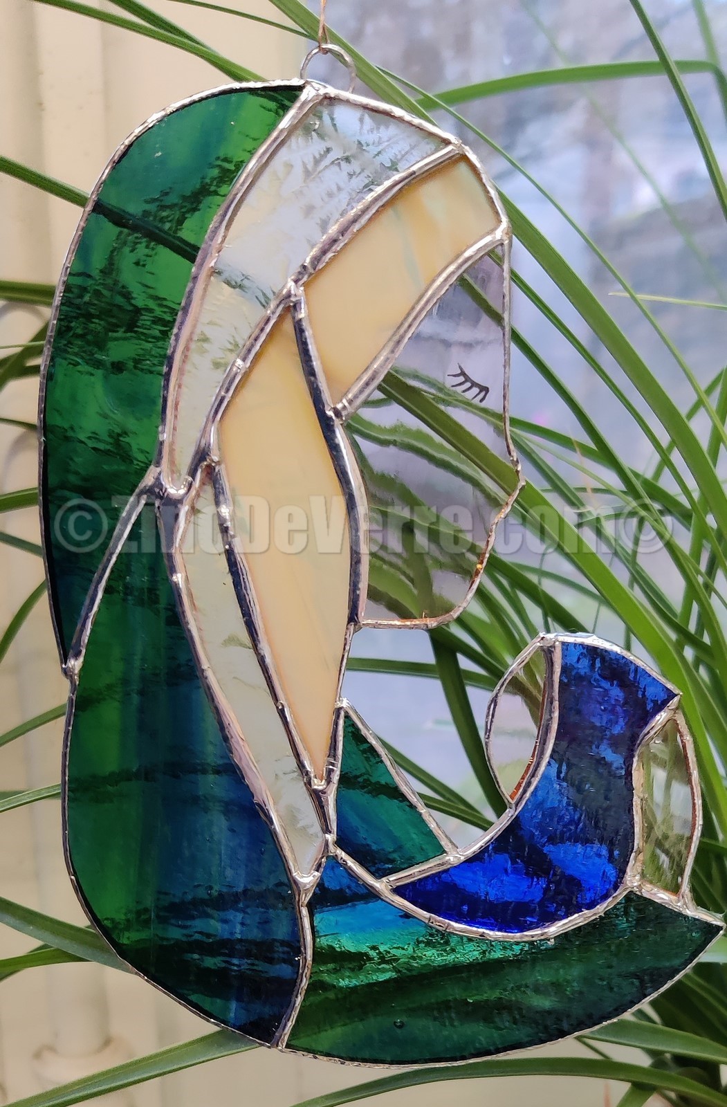 Chaque pièces de verre et découper à la main puis sertie au ruban de cuivre, avant d'être soudé à l'étain.